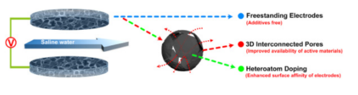 Figure 4.使用F-N-GPM樣品作為獨立電極的CDI系統(tǒng)示意圖。