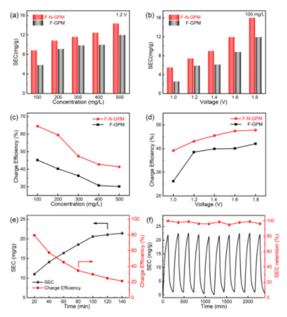 Figure 5. 獨立電極的脫鹽性能。F-N-GPM和F-GPM電極在不同鹽水濃度下的(a) SECs和(c)電荷效率;在不同電壓下的(b) SECs和(d)電荷效率。(e) F-N-GPM在不同操作時間下的SECs和充電效率;(f) F-N-GPM 電極在1.8V電位下100mg/L NaCl溶液中的SECs和脫鹽再生曲線。