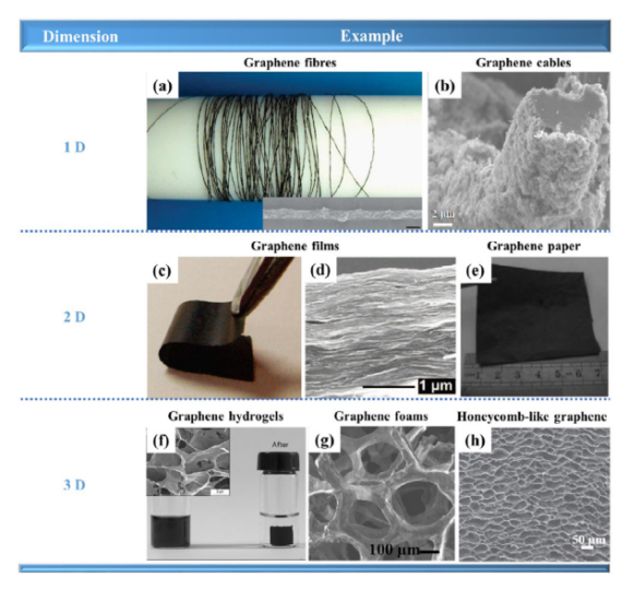 圖8. 不同維度的石墨烯基宏觀結(jié)構(gòu)示意圖。(a)和(b)為石墨烯基一維宏觀形式。 (c)-(e)為石墨烯基二維宏觀形式。(f)-(h)為石墨烯基三維宏觀形式。