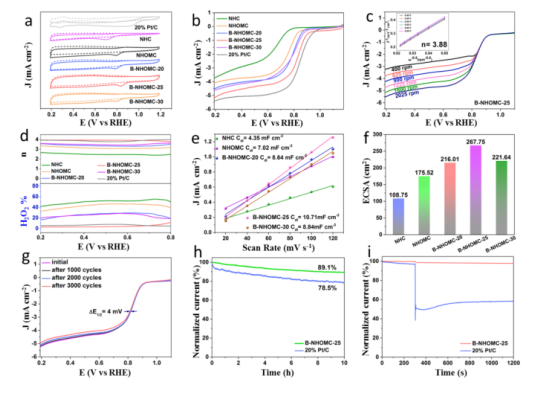 Figure 4.電化學(xué)性質(zhì)表征。不同樣品的(a) N2-或O2飽和的0.1 M KOH中CV曲線,(b) LSV曲線,和(c)不同轉(zhuǎn)速下的LSV曲線(插圖:相應(yīng)的K-L圖)。(d)不同樣品的過氧化物產(chǎn)率(H2O2%)和電子轉(zhuǎn)移數(shù)(n),(e)計(jì)算的掃描速率和電容電流密度的線性擬合曲線,和(f)對應(yīng)的ECSA。(g)B-NHOMC-25電極在1000、2000和3000圈CV循環(huán)前后的LSV曲線對比。(h)計(jì)時(shí)電流響應(yīng)。(i)甲醇耐受性評估。