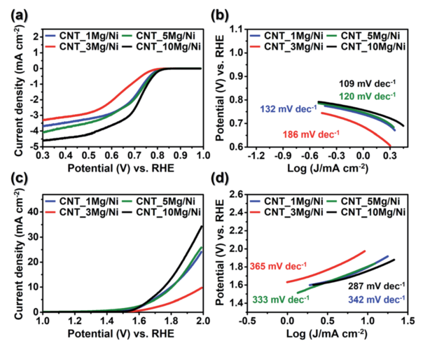 xMg/Ni的ORR和(c, d) OER性能:(a) LSV曲線(xiàn),(b) Tafel曲線(xiàn),(c) LSV曲線(xiàn),以及(d)相應(yīng)催化劑的Tafel圖。