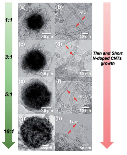 _xMg/Ni: (a和b) 1: 1, (c和d) 3: 1, (e和f) 5: 1, (g和h) 10: 1的不同Mg和Ni比例的透射電鏡圖像。