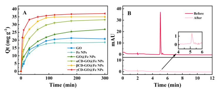 圖1 (A)不同復(fù)合材料OTC吸附量的時(shí)間變化規(guī)律;(B) OTC暴露于γCD-GO@Fe NPs 120分鐘前后的HPLC圖譜。