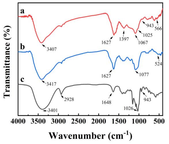 圖5 γCD-GO@Fe NPs (a)、GO@Fe NPs (b)和γ- CD (c)的FT-IR譜圖。