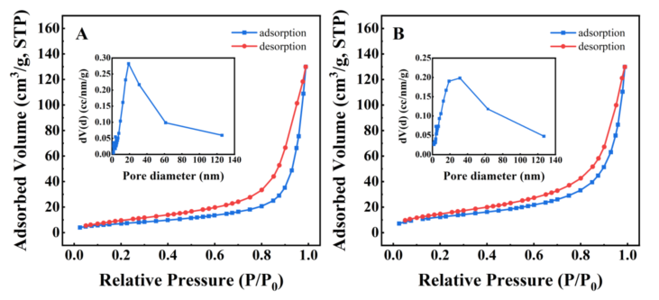 圖6所示 GO@Fe NPs (A)和γCDGO@ Fe NPs (B)的氮吸附-解吸等溫線及其相應(yīng)的孔徑分布。