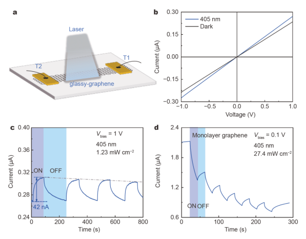 圖2. 與單層石墨烯光電探測(cè)器相比,幾層玻璃態(tài)石墨烯光電探測(cè)器的光響應(yīng)性能結(jié)果。(a)照明下玻璃態(tài)石墨烯光電探測(cè)器的示意圖。(b)玻璃態(tài)石墨烯光電探測(cè)器在黑暗和405nm光照下的