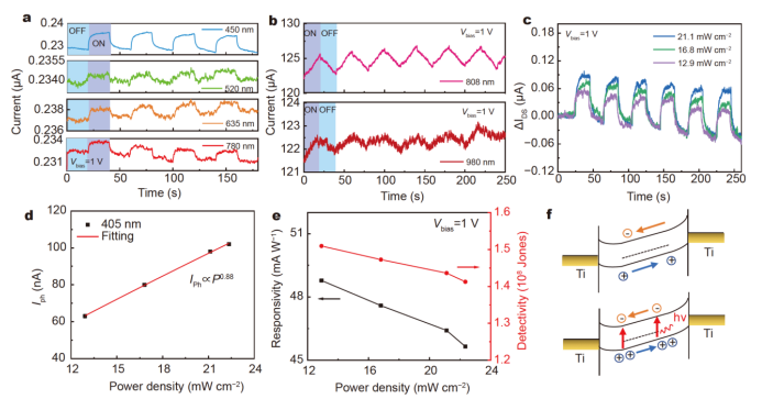 -2,405nm的激光照射下的激光開(kāi)關(guān)光響應(yīng)動(dòng)力學(xué)。施加的恒定電壓為1V。(d)在405nm,功率密度為27.4 mW cm
