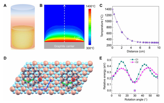 圖1. 藍(lán)寶石(0001)面對石墨烯的取向誘導(dǎo)作用機(jī)制。(A) 感應(yīng)加熱石墨烯甚高溫生長設(shè)備示意圖;(B, C) 反應(yīng)腔室溫度模擬分布;(D) 石墨烯納米島在Al