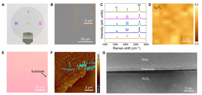 圖2. 晶圓尺寸單層石墨烯的表征。(A) 石墨烯/藍(lán)寶石晶圓的實物照片;(B) 石墨烯薄膜的典型 SEM 圖像;(C) 石墨烯薄膜的拉曼光譜;(D) 石墨烯薄膜的拉曼 I