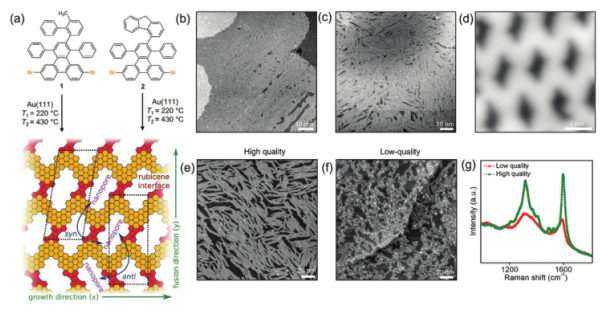 Figure 1. C-NPG的生長(zhǎng)和結(jié)構(gòu)鑒定。a) 自下而上合成C-NPG的示意圖。(b-d)低倍和高倍下的掃描隧道顯微鏡(STM,HR-STM)圖像。e-f) 高質(zhì)量 (V = -1.8 V; I = 20 pA) 和 f) 低質(zhì)量(V = −2 V; I = 20 pA)的兩種不同低覆蓋率單層 C-NPG 薄膜的 STM 圖像。g) 對(duì)應(yīng)于圖 (e) 和 (f) 中所示樣品的拉曼光譜。