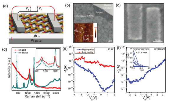 Figure 2. 器件結(jié)構(gòu)、傳輸和電氣特性。a) 局部背柵 C-NPG FET 的器件結(jié)構(gòu)示意圖。b) C-NPG 薄膜的SEM)圖像。c) C-NPG 器件的 SEM 圖像。d) 在Au上和器件上 C-NPG的拉曼光譜。e) 室溫 I