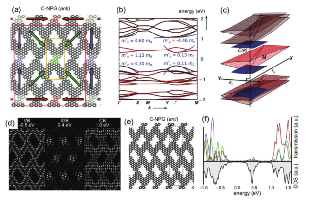 Figure 3. C-NPG電荷輸運(yùn)的理論分析。a)C-NPG的示意模型。b)C-NPG的電子波段的色散。c)與圖(b)相同波段的色散。d)在帶起始處計(jì)算的空間 LDOS。e)C-NPG的結(jié)構(gòu)。f)傳輸(頂部)和 DOS(底部)與能量的函數(shù)關(guān)系。