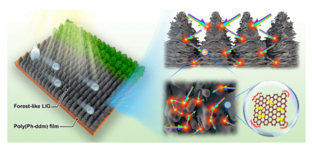 為實現高的太陽能利用效率,開發(fā)對太陽光具有寬帶吸收和高轉換效率的光熱材料,是一個快速發(fā)展的研究熱點。受高太陽能利用率森林結構的啟發(fā),這里通過在聚苯并噁嗪樹脂(poly(Ph-ddm))上進行激光刻劃,設計制備了一個由密集排列的多孔石墨烯組成的石墨烯薄膜,這種結構顯著減少了石墨烯作為二維材料的光反射作用。結合石墨烯先進的光熱轉換特性,所獲得的3D結構石墨烯薄膜被命名為森林狀激光誘導石墨烯(forest-like LIG)。在整個太陽光波長范圍內,光吸收高達 99.0%,以及優(yōu)異的光熱轉換性能(模擬陽光照射30秒就達到 87.7 °C),平衡溫度為 90.7 ± 0.4 °C。得益于該材料的超疏水特性,開發(fā)了一種具有快速響應和高運動速度的光熱致動器,以及一種具有持久抗鹽性能和高太陽能蒸發(fā)效率的太陽能驅動界面脫鹽膜。