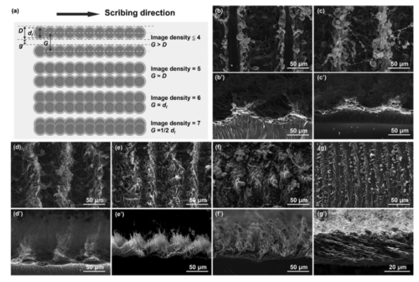 Figure 2. (a)不同圖像密度下的激光刻劃示意圖。(b-g,b’-g’)表面和橫截面掃描電鏡圖像。