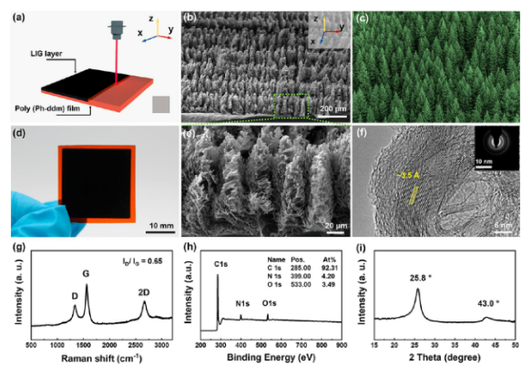 Figure 3. (a) 制備森林狀 LIG 的示意圖。(b) SEM 圖像。(c)北方針葉林的數字圖像。(d) 森林狀LIG的數字圖像。(e) SEM的放大視圖。(f) LIG 薄片的HRTEM 圖像。(g) 拉曼、(h) XPS譜圖和(i) XRD圖。