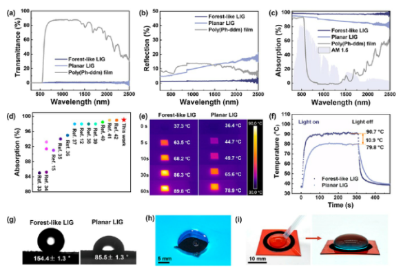 Figure 4. (a-c) LIG和基質聚(Ph-ddm)的透射率、反射率和吸收強度。(d)光吸收強度比較。(e)紅外熱圖像。(f)在1次太陽照射下,干燥LIG的溫度隨時間的變化。(g)兩種LIG的水接觸角。(h)森林狀LIG的摩西效應。(i)森林狀LIG環(huán)的“變異摩西效應”。