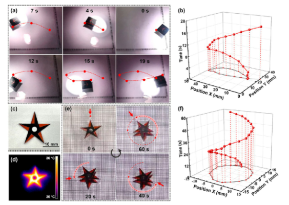 Figure 5.紫外激光下的光驅動運動。( a-f )由紫外激光刺激的F-致動器的光驅動運動。(g)復雜路徑中的光驅動運動。(h)在紫外激光下,兩個基于濕式 LIG致動器的溫度隨時間變化。(i-k)兩個基于LIG 執(zhí)行器的位移,相應的響應時間和平均速度。