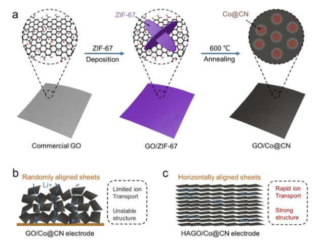 Figure 1. (a)GO/Co@CN納米片的合成工藝示意圖,(b)隨機(jī)排列GO/Co@CN納米片的對(duì)照電極,(c)水平排列GO/Co@CN納米片的電極示意圖。