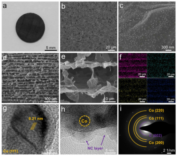 Figure 2. (a) HAGO/Co@CN電極的數(shù)碼照片。(b-c)SEM圖像。(d-f) HAGO/Co@CN電極的橫截面SEM圖像及相應(yīng)的元素分布。(g-i)高分辨率透射電鏡圖像及相應(yīng)的SAED模式。