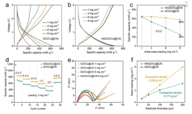 石墨烯基2D材料由于其高電化學(xué)活性、快速載流子遷移率和高電子電導(dǎo)率,它在電化學(xué)能量存儲(chǔ)方面顯示出非凡的前景。然而,低的比容量(< 200 mAh g-1)和有限的離子傳輸嚴(yán)重阻礙了它們的實(shí)際應(yīng)用。這里,使用金屬-有機(jī)骨架衍生的鈷@碳氮(Co@CN)修飾的水平排列氧化石墨烯(HAGO/Co@CN)陣列,作為獨(dú)立陽(yáng)極來(lái)解決這個(gè)問(wèn)題,在高面積容量(> 5mAh cm−2)下實(shí)現(xiàn)穩(wěn)定的循環(huán)測(cè)試。HAGO/Co@CN電極中高度互穿的氧化石墨烯框架加速了電子傳輸。此外,得益于先進(jìn)的層狀結(jié)構(gòu),HAGO/Co@CN電極表現(xiàn)出優(yōu)異的結(jié)構(gòu)穩(wěn)定性和厚度無(wú)關(guān)的電化學(xué)性能。通過(guò)系統(tǒng)地調(diào)整電極內(nèi)部GO/Co@CN納米片的取向,優(yōu)化電子/離子傳輸,在高載量下實(shí)現(xiàn)了高面容量和高速率特性。更重要的是,用NCM622作為陰極和GO/Co@CN作為陽(yáng)極設(shè)計(jì)的全電池,在500次循環(huán)后,高容量保持率高于98%,具有商業(yè)級(jí)的可逆容量(2.3 mAh cm−2)。