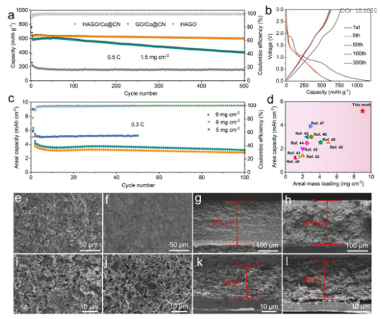 Figure 4. (a) 不同電極的長(zhǎng)期循環(huán)性能。(b) 對(duì)應(yīng)于長(zhǎng)期循環(huán)穩(wěn)定性的電壓曲線(xiàn)。(c) HAGO/Co@CN電極的面積容量。(d)面積容量比較。(e-f,i-j)循環(huán)前后的SEM圖。(g-h,k-I)循環(huán)前后的橫截面SEM圖。