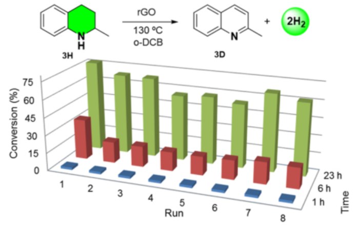 圖 4. rGO作為碳催化劑催化氮雜環(huán)脫氫的活性。反應(yīng)條件:四氫喹哪啶(3H,0.3 mmol),催化劑負(fù)載量(30mg rGo),以鄰二氯代苯(2.0 mL)為溶劑,溫度為130℃,轉(zhuǎn)化率用氣相色譜/火焰離子化檢測(cè)器(GC/FID)測(cè)定,以1,3,5-三甲氧基苯為內(nèi)標(biāo)。