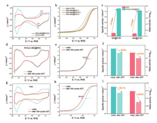 Figure 3.(a)Pt1Co1-IMC@Pt/C-2.5和商用Pt/C催化劑的CV曲線比較;(b)各種催化劑的ORR LSV曲線;(c)0.9V/RHE的質(zhì)量活性和面積活性;(d-i) Pt1Co1-IMC@Pt/C-2.5和Pt/C催化劑的穩(wěn)定性評估,包括ADT前后的CV、LSV、 SAs和MAs比較。