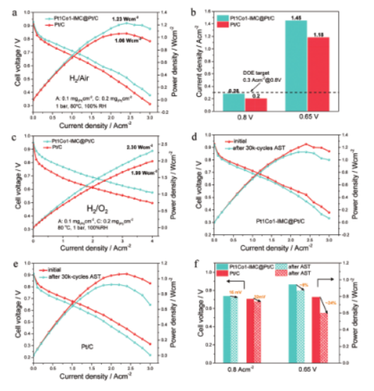 Figure 5. (a)在H2-空氣條件下,膜電極組件的穩(wěn)態(tài)極化曲線;(b)0.8和0.65 V時的電流密度;(c) H2-O2燃料電池的性能比較;(d) Pt1Co1IMC@Pt/C和(e)商用Pt/C的H2-空氣燃料電池在AST前后的極化曲線;(f)AST試驗后的電壓降和功率密度損失。