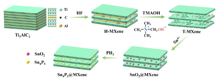 3納米顆粒組成的集成電極,夾在過渡金屬碳化物(MXene)納米片之間。四甲基氫氧化銨(TMAOH)通過產生帶有擴展層間距的MXene負電荷片,在這種夾層結構的形成中發(fā)揮了重要作用。強大的C-O-P氧橋接鍵使得Sn