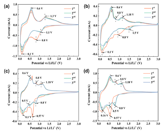 2@MXene雜種前三個周期的CV曲線為:(a) SnO