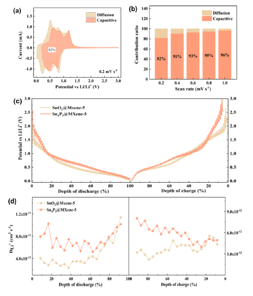 3@MXene-5在不同掃描速率下的電容貢獻比,(c) SnO
