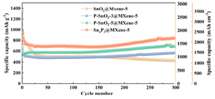 3納米粒子能夠在MXene層表面緊密錨定。sn4p3基納米復合材料具有較高的可逆容量,初始庫侖效率為82%,以及出色的速率性能(1519 mAh cm