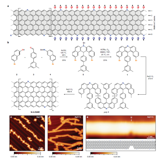 以氫為端基的鋸齒形納米石墨烯的自旋有序電子態(tài)產(chǎn)生了磁性量子現(xiàn)象,這引發(fā)了對碳基自旋電子學的新的興趣。鋸齒形石墨烯納米帶(ZGNRs)是由平行鋸齒形邊緣包圍的準一維石墨烯半導(dǎo)體帶,其本征電子邊緣態(tài)沿其邊緣呈鐵磁有序排列,并沿其寬度(1,2,5)呈反鐵磁耦合。盡管最近的進步GNRs具有對稱拓撲保護的自下而上的合成階段,甚至金屬零模式帶,獨特的磁結(jié)構(gòu)邊緣ZGNRs一直從直接觀察了一個強大的雜交的鋸齒形邊緣狀態(tài)與表面狀態(tài)的基礎(chǔ)支持。在本文中,我們提出了一種通用的技術(shù),通過在ZGNR邊緣引入一個取代n原子摻雜的超晶格,來實現(xiàn)熱穩(wěn)定和電子解耦高反應(yīng)性的自旋極化邊緣態(tài)。第一性原理GW計算和掃描隧穿光譜揭示了由鐵磁有序邊緣態(tài)引起的交換場(~850特斯拉)對低氮單對平帶的巨大自旋分裂。我們的發(fā)現(xiàn)直接證實了ZGNRs.中預(yù)測的出現(xiàn)磁序的性質(zhì),并為其探索和功能集成到納米級傳感和邏輯器件提供了一個強大的平臺。