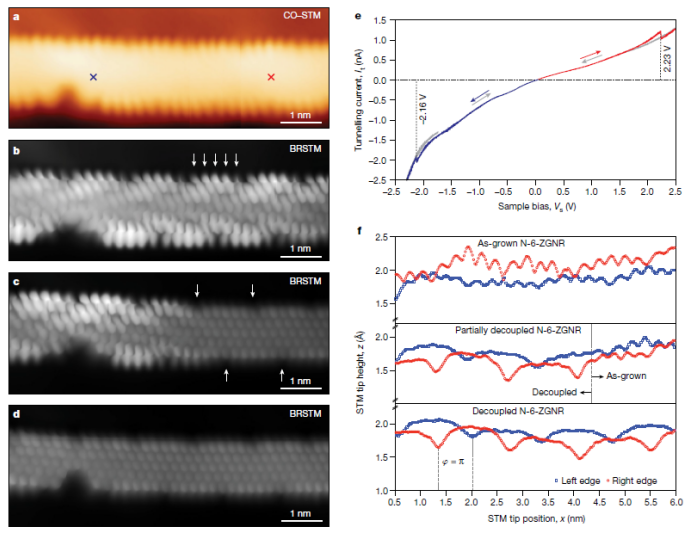圖2. a,使用CO-功能化STM尖端記錄的全環(huán)化N-6-ZGNR段的地形圖像。b, a給出的N-6-ZGNR段的等高BRSTM圖像。箭頭表示N-6-ZGNR邊緣與C - H群相關(guān)的五個葉的位置。c,在a (V = 0 mV, Vac = 11 mV, f = 455 Hz)中標記的位置,使用正電壓掃頻從V = 0.0 V到V = +2.5 V的尖端誘導(dǎo)解耦后的N-6-ZGNR段的恒定高度BRSTM圖像。d,在c (V = 0 mV, Vac = 11 mV, f = 455 Hz)的解耦中,使用從V = 0.0 V到V = 2.5 V的負電壓掃頻對N-6-ZGNR段進行末端誘導(dǎo)解耦(V = 0 V, Vac = 11 mV, f = 455 Hz)。e,電壓掃描。f, STM高度剖面顯示了一個代表生長的N-6-ZGNR(上)、部分解耦的N-6-ZGNR(中)和完全解耦的N-6-ZGNR(下)沿左邊緣(藍色方塊)和右邊緣(紅色圓圈)記錄的波磨。