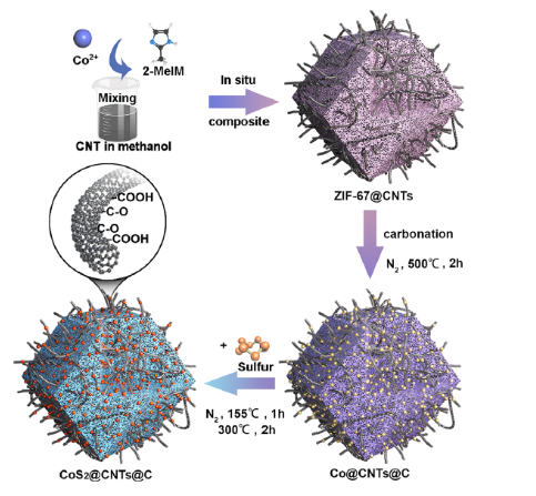 圖 1. CoS2@CNTs@C復(fù)合材料局部碳化和硫化示意圖。