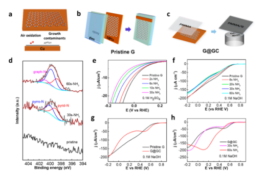 Figure 2. 用于ORR的石墨烯電極制備。(a) CVD 石墨烯薄膜的非對(duì)稱表面示意圖。(b)制備原始石墨烯。(c)制備G@GC。(d) N1s XPS光譜。(e) 線性掃描伏安法 (LSV) 極化曲線。 (f) 氮化0至60秒后石墨烯的LSV曲線。 (g) 原始G和 G@GC的LSV 曲線。(h) G@GC在氮化30和60 s前后的LSV曲線。