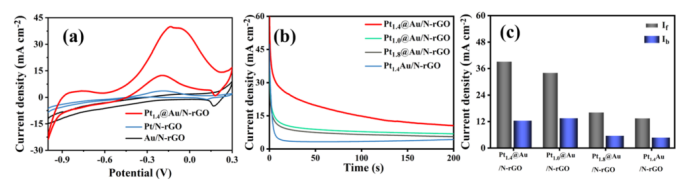 1.4Au/N-rGO和-0.05 V下的Ptm@Au/N-rGO催化劑。(c)從CV曲線總結(jié)的Ibof Pt