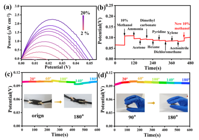 圖 5. 自供電甲醇蒸汽傳感器的傳感和靈活性性能。 (a)功率密度隨甲醇蒸汽濃度為 2-20%(增量為 2%)而變化。 (b)自供電甲醇傳感器在VOC中的選擇性性能,包括氨、丙酮、碳酸二甲酯、四氫呋喃、己烷、吡啶、二氯甲烷、己烷、二甲苯、二氯甲烷和乙腈。 VOC 的濃度為 2% v/v。 在20%甲醇蒸汽中連續(xù)(c)扭曲和(d)向0-180°彎曲下的放電行為。