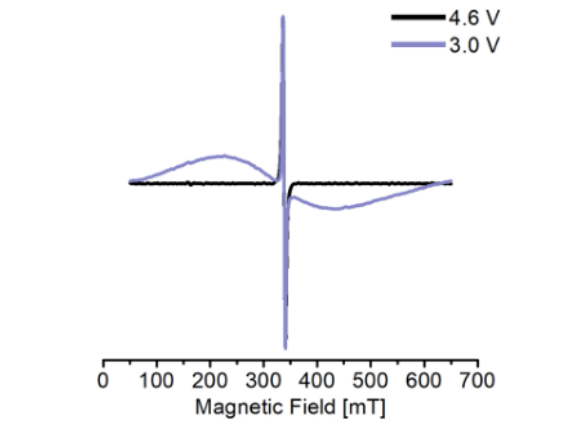 圖 1. NMC811復(fù)合材料在C/10下首次充電至4.6 V vs Li/Li+(黑線)和相應(yīng)放電至3.0 V vs Li/Li+(紫線)后的X波段EPR光譜。光譜中心的尖峰對(duì)應(yīng)于復(fù)合材料中的導(dǎo)電碳,而放電時(shí)觀察到的寬線形被指定為NMC811。