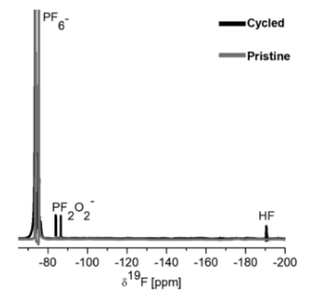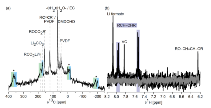 圖 2.(a)NMC811陰極膜的直接極化13C MAS SSNMR,該陰極膜在C/10下經(jīng)歷了50次恒電流循環(huán),并在4.6 V vs Li/Li+下分解。MAS 頻率 = 28 kHz。 星號(hào)表示旋轉(zhuǎn)邊帶。(b) NMC811/Li 電池在 NMR管電池中的原位溶液1H NMR,在 C/10 在 3.0 和 4.6 V(黑色)之間進(jìn)行 10 次恒電流循環(huán)后,與原始電解質(zhì)(灰色)的 NMR 譜重疊。