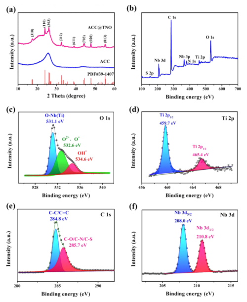 圖 2. (a) ACC和ACC@TNO 復(fù)合材料的XRD譜圖和 (b) ACC@TNO、(c) Ti 2p、(d) O 1s、(e)C 1s和(f)Nb的精細(xì) XPS 3d光譜。