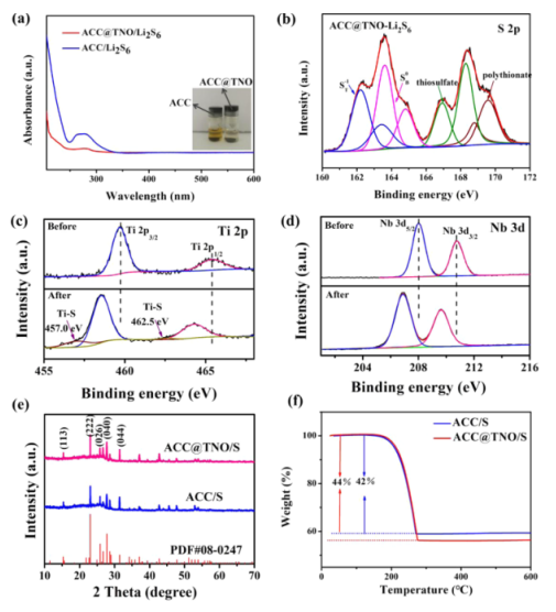 6溶液前后的Ti 2p和(d) Nb 3d的XPS測(cè)量光譜,(e)ACC/S和ACC@TNO/S的XRD圖像,以及(f)ACC/S和ACC@TNO/S的TGA曲線。