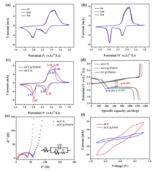 −1時(shí)的CV曲線;(d) ACC/S和ACC@TNO/S在0.2 C時(shí)的第一次充放電曲線;(e)ACC@TNO/S 和 ACC/S 的 EIS 曲線;(f)ACC和ACC@TNO對(duì)稱電池的CV曲線。