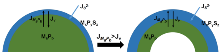 圖5.磷硫化處理過程中的Kirkendall效應(yīng)示意圖。