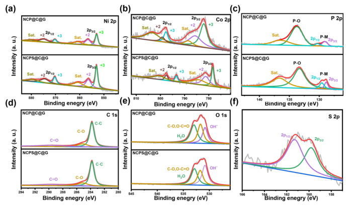 圖 6. NCP@C@G和NCPS@C@中(a) Ni 2p、(b) Co 2p、(c) P 2p、(d) C 1s 和 (e) O 1s的XPS高分辨率光譜 G。(f) NCPS@C@G中S 2p的XPS高分辨率光譜。