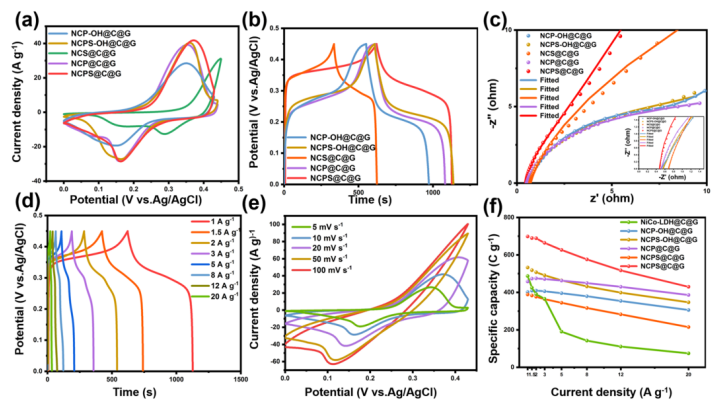 圖 7. (a) CV曲線、(b) GCD曲線和 (c) NCP−OH@C@G、NCPS−OH@C@G、NCP@C@G和 NCPS@C@G的EIS光譜。(d)NCPS@C@G 的GCD曲線和(e)CV曲線。(f)NCP-OH@C@G、NCPS-OH@C@G、NCP@C@G和NCPS@C@G電極的比電容。