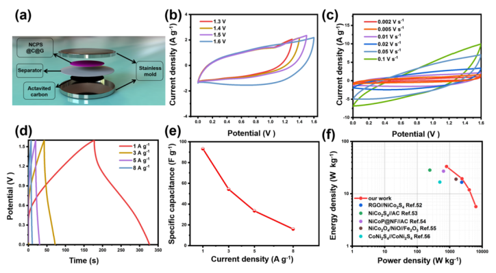 圖 8. (a) NCPS@C@G//AC ASC設(shè)備示意圖。NCPS@C@G//AC ASC的性能:(b) 10 mV s