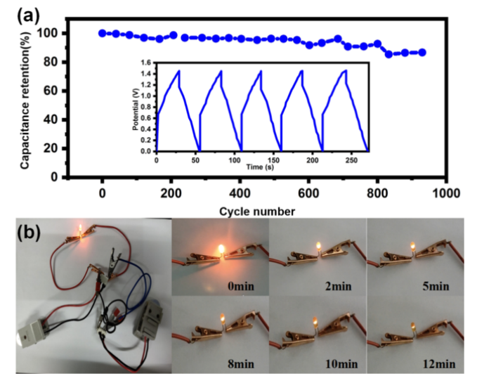 圖 9. (a) NCPS@C@G//AC 器件的電容保持率。(a)的插圖是最后五個循環(huán)的GCD曲線。(b)驅(qū)動 LED 指示燈的設(shè)備的照片。