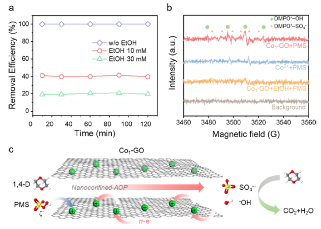 圖5。(a)有無(wú)乙醇的1,4- d去除效率。(b) DMPO (120 mM)自旋捕獲劑體系的EPR光譜。(c) PMS活化過(guò)程中CO1-GO膜中的降解機(jī)理。