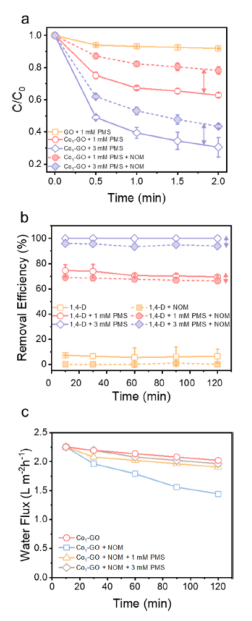 圖4。 (a)流量測(cè)試系統(tǒng)示意圖。(b)GO和CO1-GO的水通量 (c) 2小時(shí)內(nèi)GO、GO-VC和Co1-GO膜的去除效率(d) 一級(jí)動(dòng)力學(xué)速率常數(shù)與停留時(shí)間t (s)的線性回歸確定。 (e)本研究在間歇體系和膜體系中的一級(jí)速率常數(shù)k與前人研究結(jié)果的比較。 (f)三種pH條件下Co1-GO膜的去除效率。